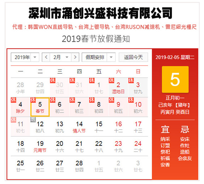 深圳市涌創(chuàng)興盛科技有限公司2019春節(jié)放假通知,公司是一定經(jīng)營直線導軌,減速機,光柵尺,直線電機等自動化設備供應廠家!