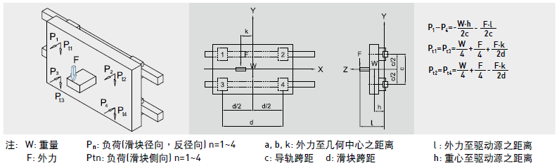 工作負荷的計算方式會隨實際受力分布的情形而產(chǎn)生變化,例如承載物體本身重心的位置、施力的位置,以及運行時起動、停止的加速度慣性力等皆對負荷的計算發(fā)生影響,因此使用直線導(dǎo)軌時必須仔細考慮各種負荷狀況,以計算出最正確的負荷值。