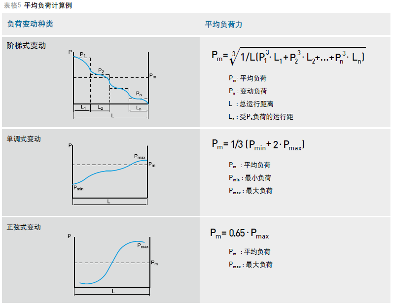 在運行中滑塊承受的負荷有時并不是均等的,比方搬送裝置的運行,其前進時額外承受貨物的重量,退回時則只承受裝置本身的重量,負荷呈現(xiàn)階梯式變化,因此必須求出運行中的平均負荷以計算壽命。平均負荷的定義是與負荷變動條件下壽命相等的等效負荷值。
