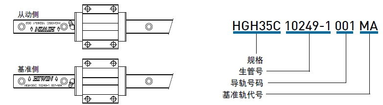 當(dāng)非互換型直線導(dǎo)軌配對使用時(shí),需注意基準(zhǔn)軌與從動軌之差異?;鶞?zhǔn)軌側(cè)邊基準(zhǔn)面精度較從動軌高,可作為床臺安裝承靠面。基準(zhǔn)軌上有刻上MA之記號,如圖所示。