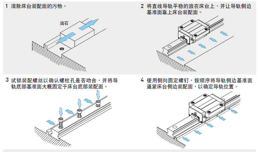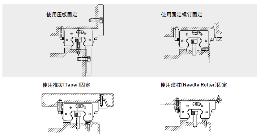 當(dāng)床臺受到振動、沖擊力的作用時(shí),導(dǎo)軌及滑塊很可能偏離原來的固定位置,而影響精度。為避免發(fā)生類似的狀況,建議使用下圖所列的四種固定方式固定導(dǎo)軌及滑塊,以確保機(jī)臺的運(yùn)行精度。
