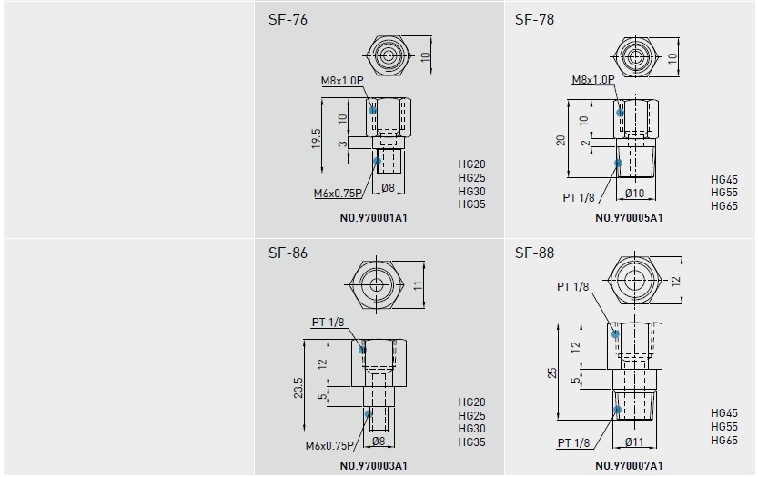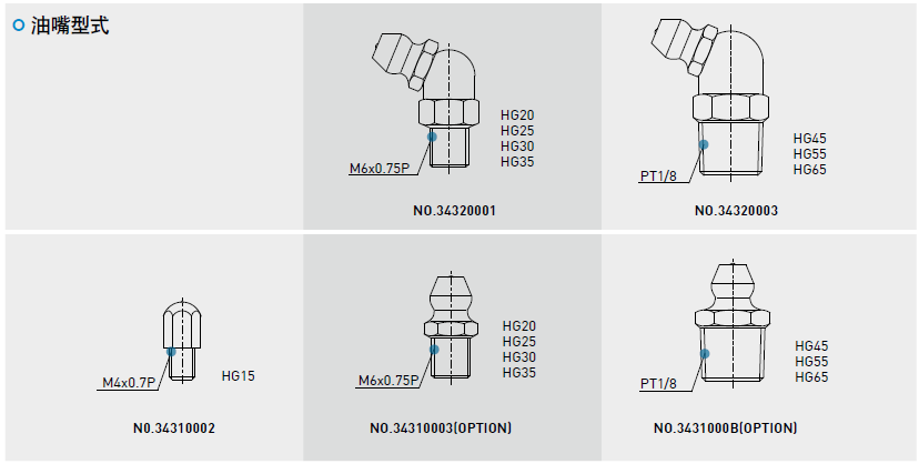 建議使用油黏滯度約為30~150cSt之潤滑油潤滑直線導(dǎo)軌,客戶可先跟我們說明需要使用油潤滑,出貨之直線導(dǎo)軌將不會(huì)封入潤滑油脂。油管接頭型式