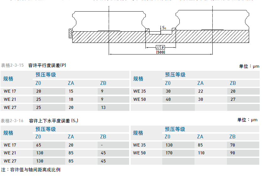 WE系列為圓弧兩點(diǎn)接觸式直線(xiàn)導(dǎo)軌,其自動(dòng)調(diào)心的特性可以吸收安裝面的些許誤差而不影響直線(xiàn)運(yùn)動(dòng)的順暢性;下表中注明了安裝平面的容許誤差值: