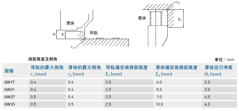 3、安裝注意事項(xiàng), 我們?cè)诔瑢?dǎo)軌的時(shí)候,要注意安裝面肩部高度及倒角,安裝直線(xiàn)導(dǎo)軌時(shí)必須注意安裝面肩部的狀況是否適當(dāng),如倒角過(guò)大,凸出的地方易造成直線(xiàn)導(dǎo)軌精度不良,而高度過(guò)高則會(huì)干涉滑塊。故如果能依照建議要求安裝面肩部,安裝精度不良即可排除。下表為QW靜音安裝面肩部高度及倒角相關(guān)參數(shù)。
